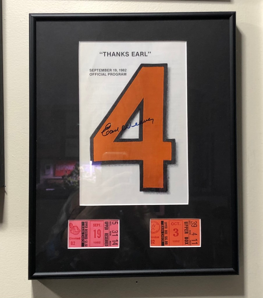 Here are two pieces of memorabilia which I later got signed by Weaver. There was a “Thanks Earl” Day on September 19, 1982. I think both the small poster and the program are from that day. I had the program framed with my ticket stubs from September 19th and the final game.