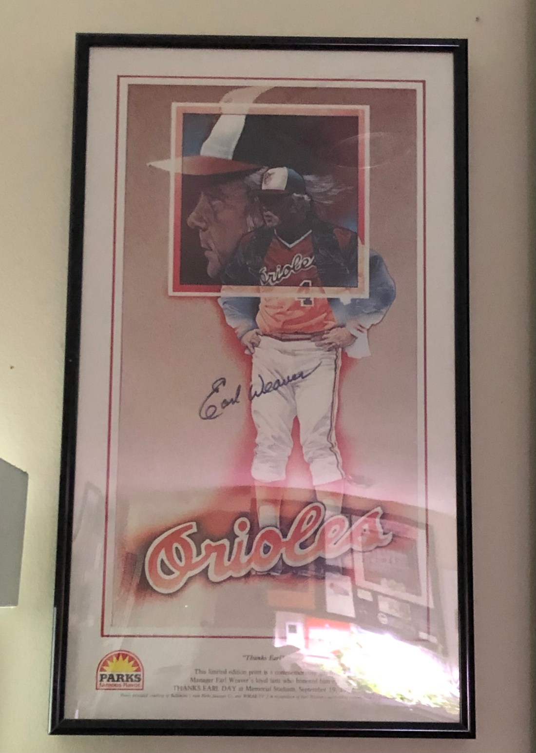 Here are two pieces of memorabilia which I later got signed by Weaver. There was a “Thanks Earl” Day on September 19, 1982. I think both the small poster and the program are from that day. I had the program framed with my ticket stubs from September 19th and the final game.